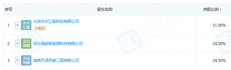 股权穿透显示,该公司由北京水木汇能科技有限公司持股51%,河北络能新能源科技有限公司持股24.5%,湖南天成吊装工程有限公司持股24.5%。
