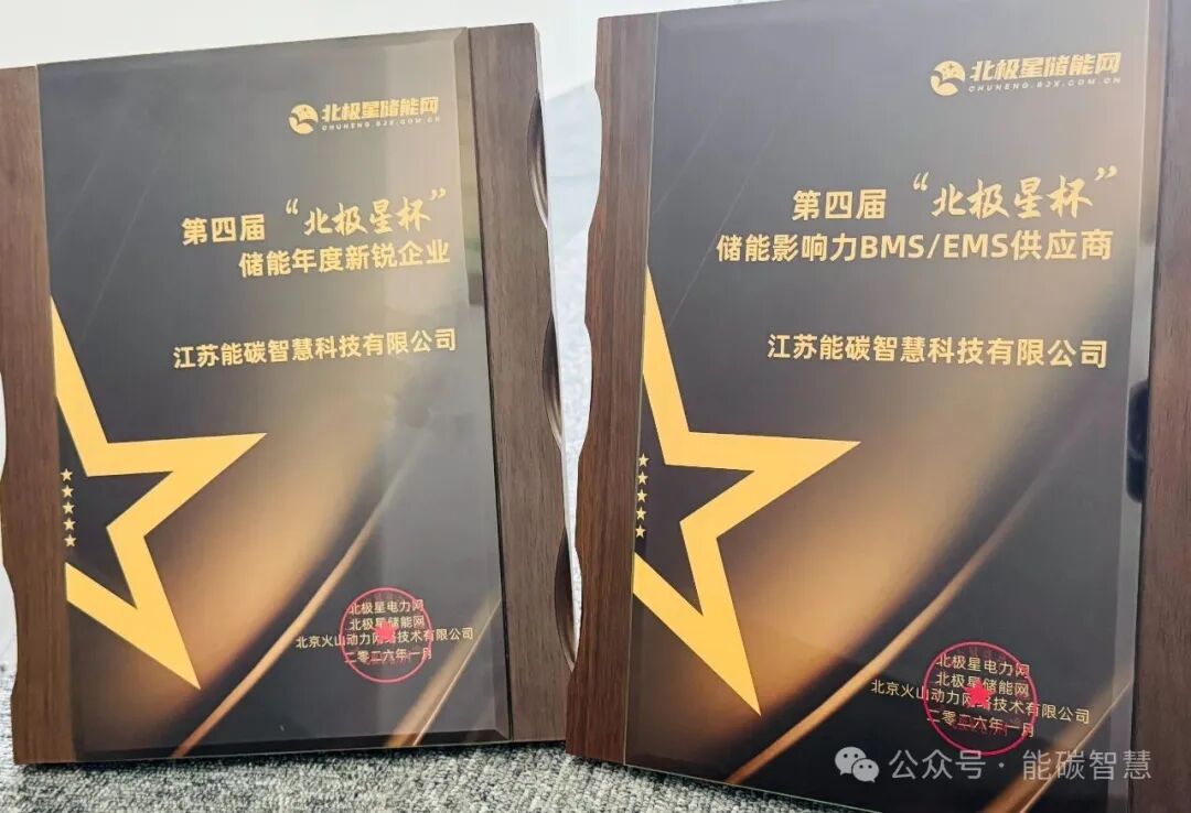 2026年1月28日,由北极星电力网、北极星储能网联合举办的2026年中国储能技术创新应用研讨会暨第四届“北极星杯”储能影响力企业评选颁奖典礼,在河南郑州圆满落幕。能碳智慧成功荣膺“储能年度新锐企业”与“储能影响力BMS/EMS供应商”奖项。