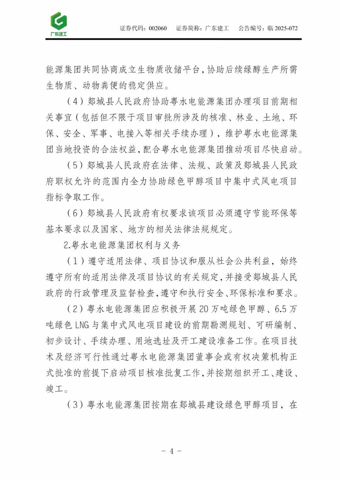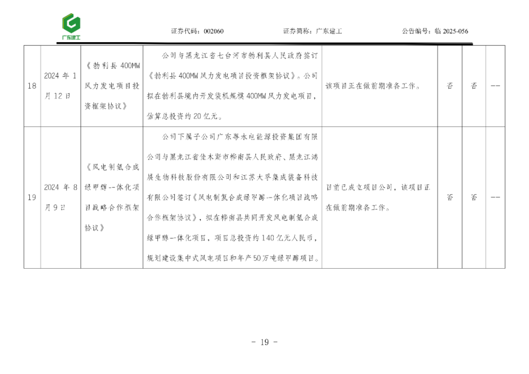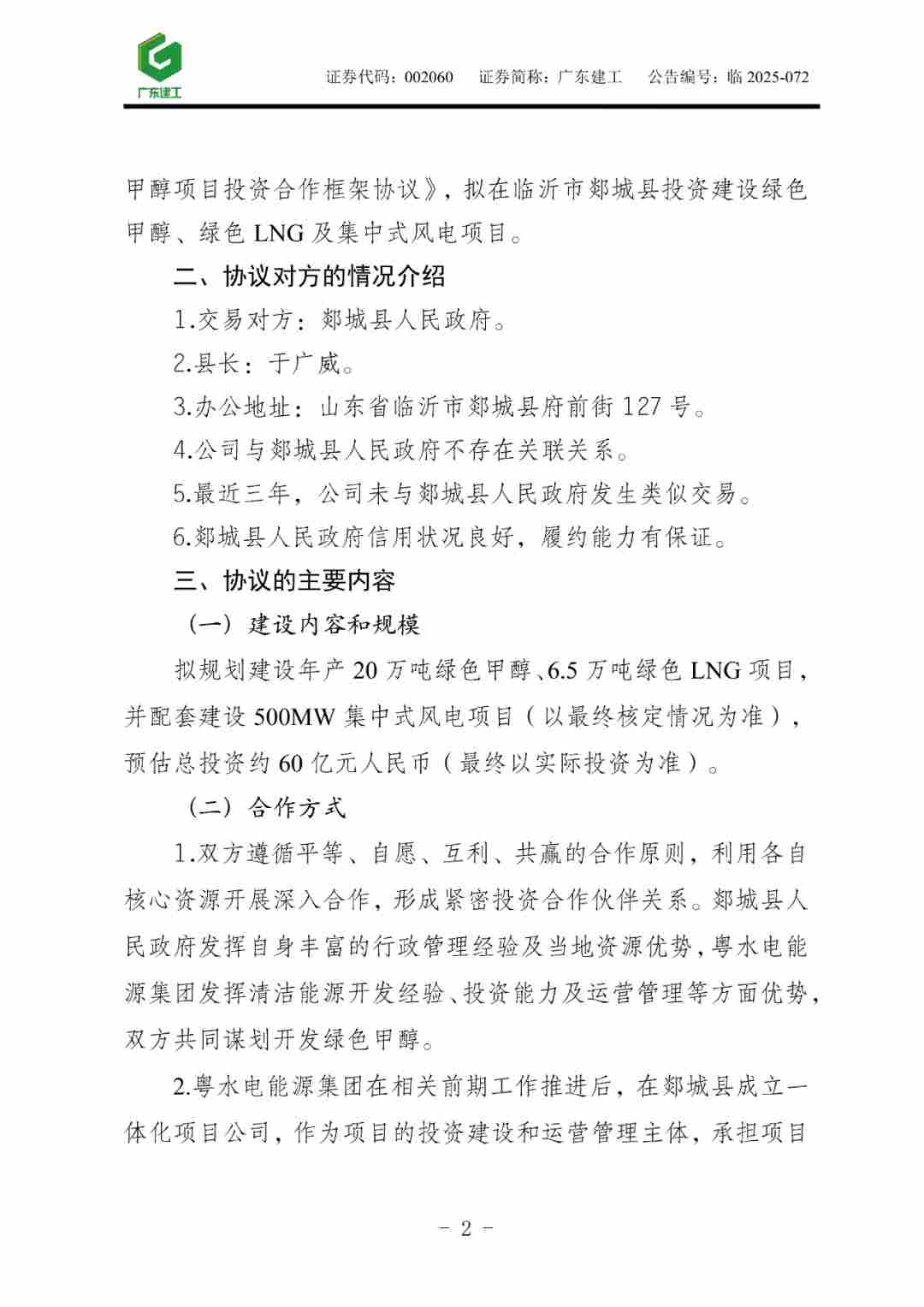 公告显示,12月26日,广东建工全资子公司广东水电二局集团有限公司的全资子公司广东粤水电能源投资集团有限公司(以下简称“粤水电能源集团”)与山东省临沂市郯城县人民政府在临沂市签订《绿色甲醇项目投资合作框架协议》,拟在临沂市郯城县投资建设绿色甲醇、绿色LNG及集中式风电项目。