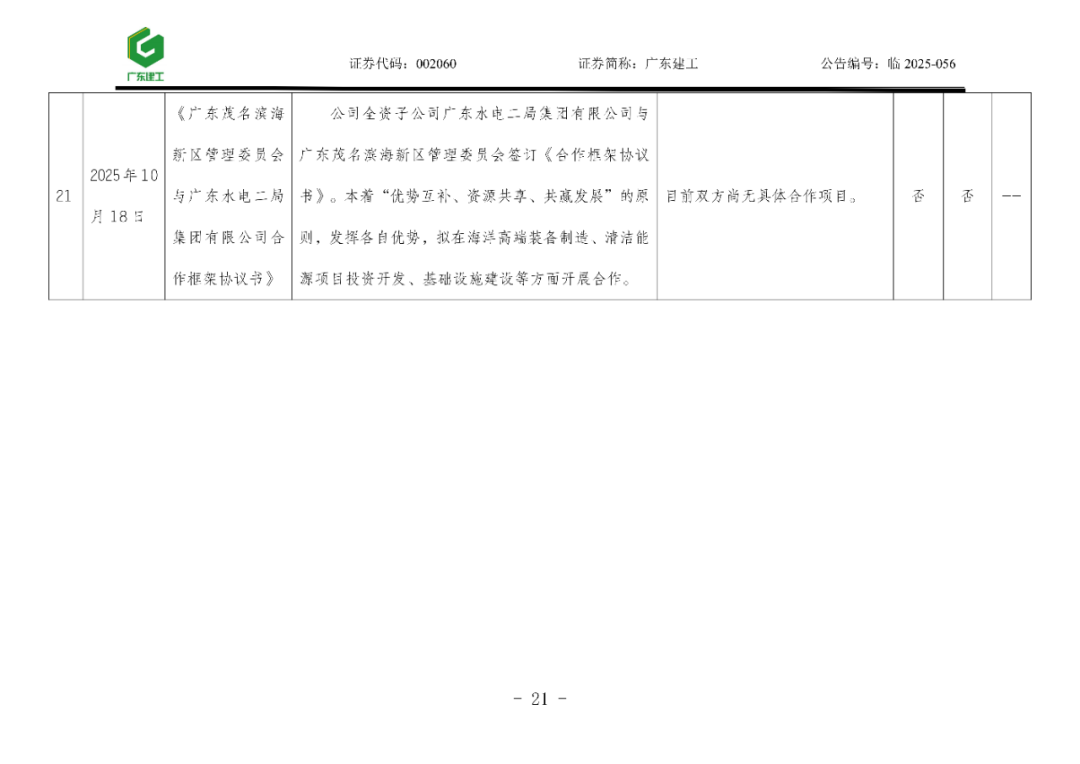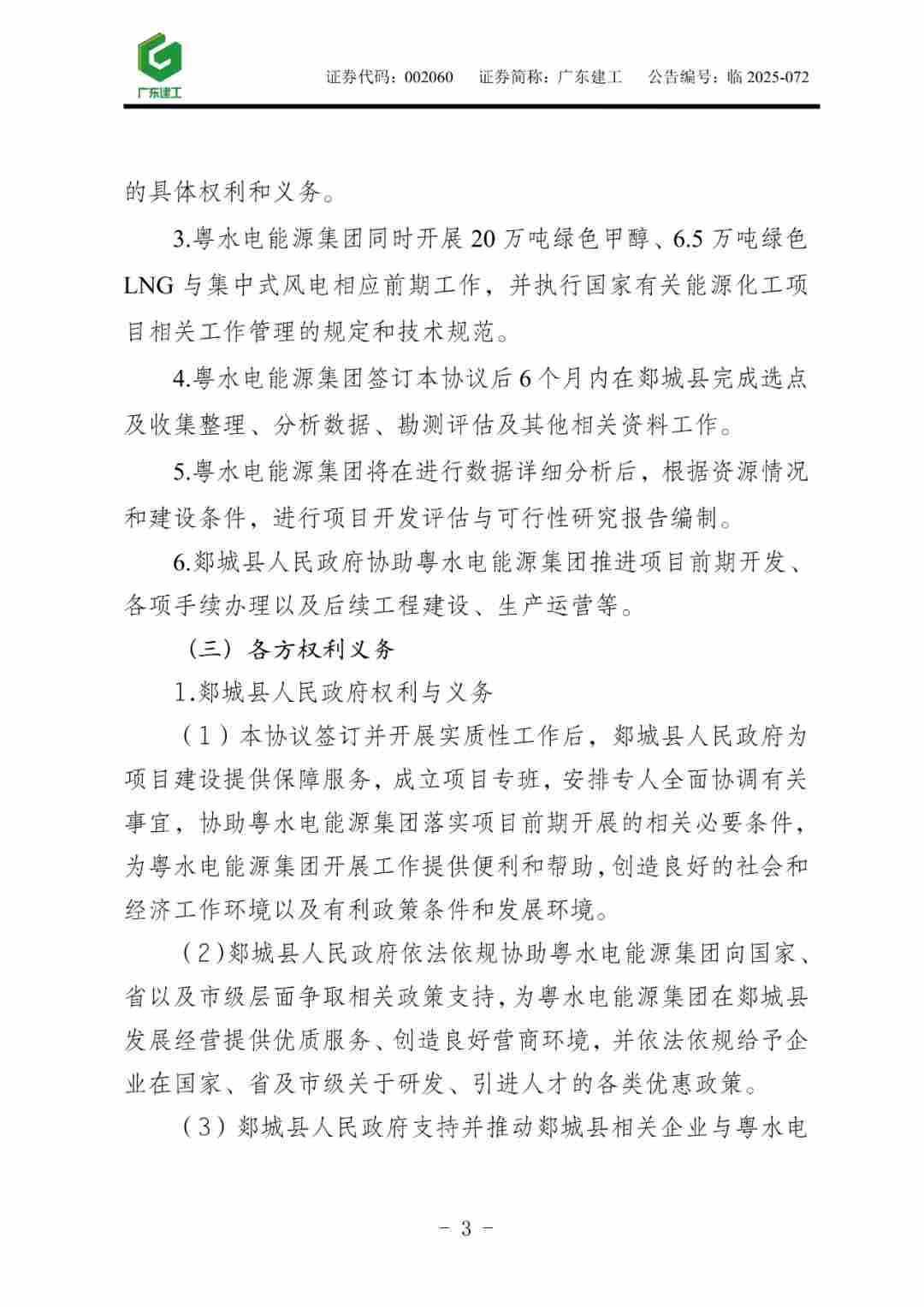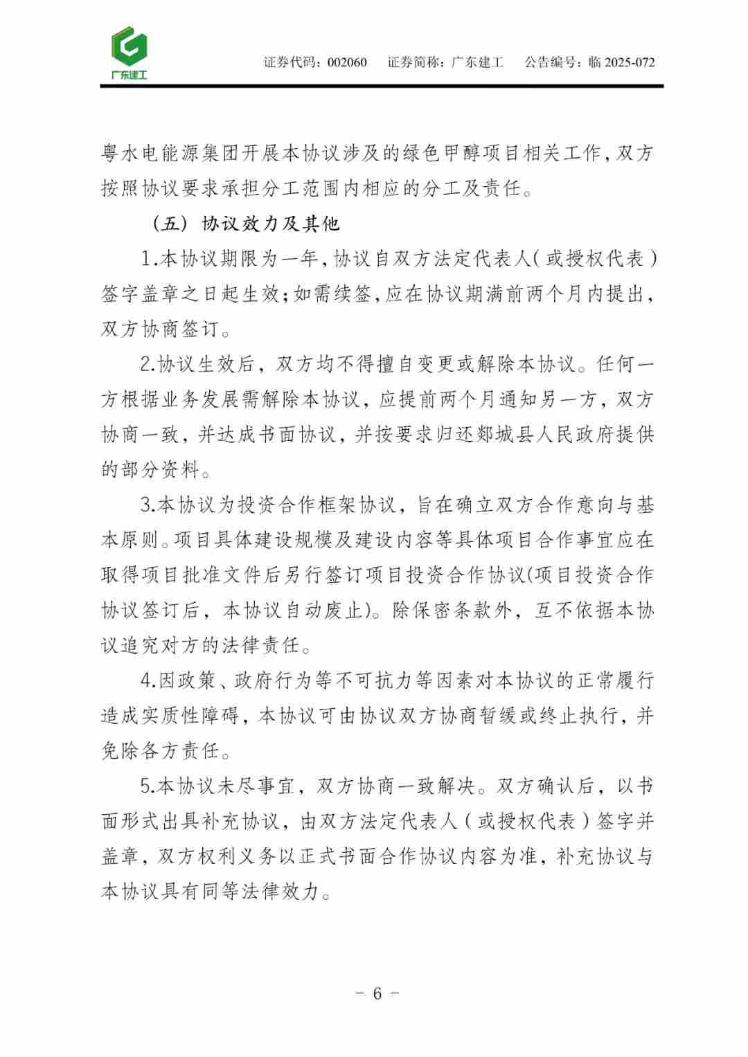 公告显示,12月26日,广东建工全资子公司广东水电二局集团有限公司的全资子公司广东粤水电能源投资集团有限公司(以下简称“粤水电能源集团”)与山东省临沂市郯城县人民政府在临沂市签订《绿色甲醇项目投资合作框架协议》,拟在临沂市郯城县投资建设绿色甲醇、绿色LNG及集中式风电项目。