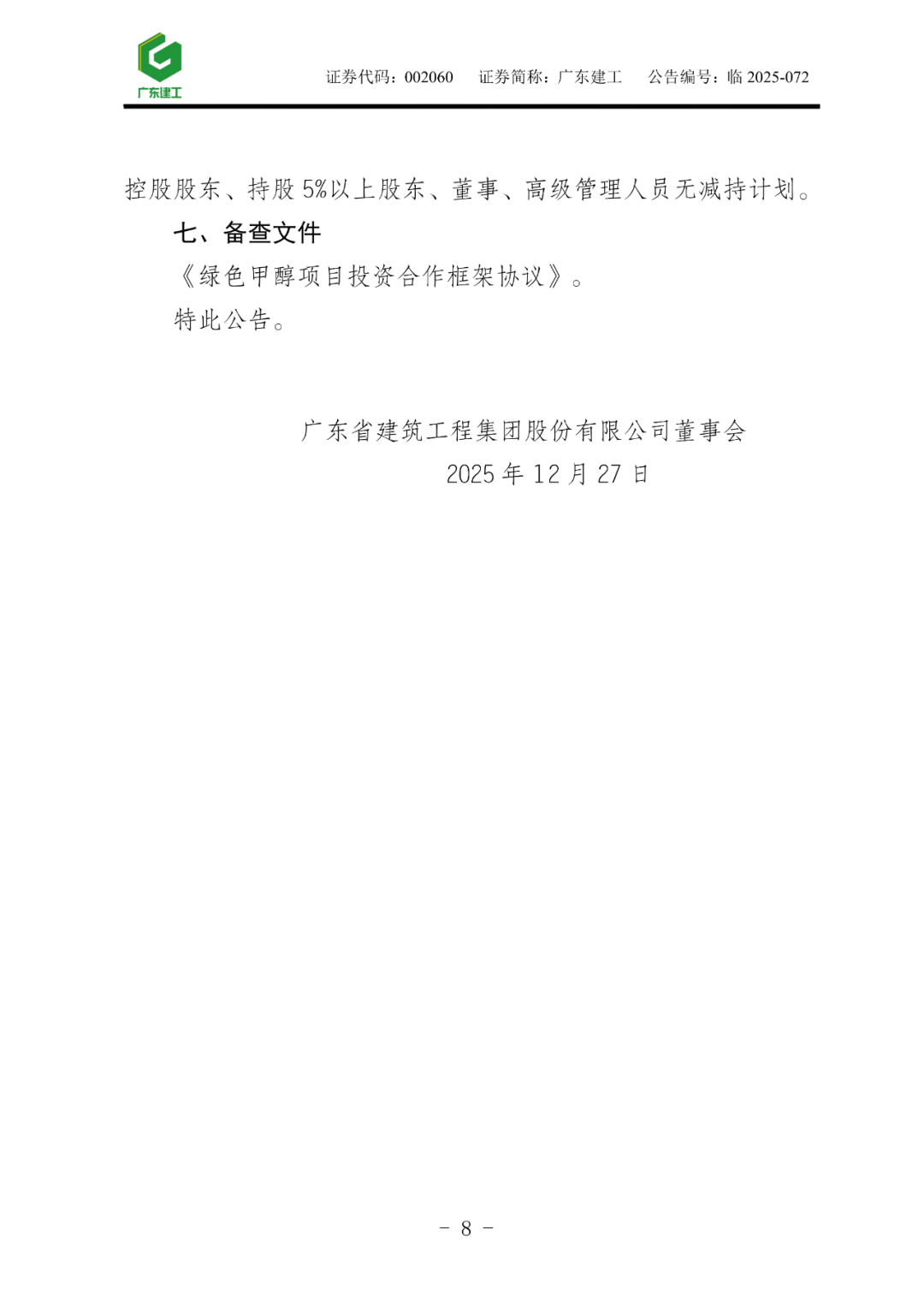 12月27日,广东省建筑工程集团股份有限公司(以下简称“广东建工”)发布《关于下属子公司签订绿色甲醇项目投资合作框架协议的公告》。