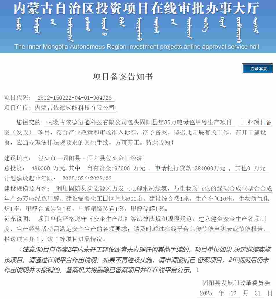 北极星氢能网获悉,12月31日,内蒙古依德氢能科技有限公司包头固阳县年35万吨绿色甲醇生产项目获备案。