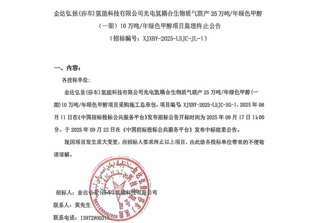 招标终止!新疆10万吨绿色甲醇项目
