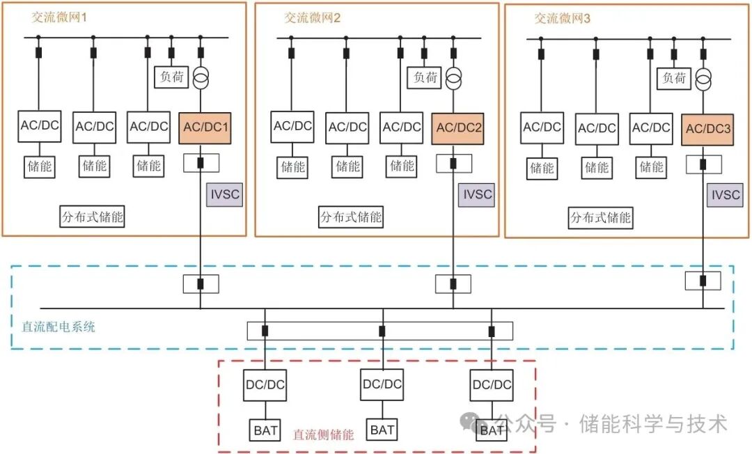 由于可再生能源具有天然的出力随机性、波动性,电力供需间的矛盾日益凸显。储能装置的充足容量和快速响应性能已成为新能源稳定运行的关键保障。储能电池由于其稳定的功率输出特性,常用作储能变流器中的储能设备。本工作通过在柔性互联交流微网群系统中引入直流侧储能系统,实现对不同情况的故障以及负荷需求时微网群内部子微网之间功率的灵活分配及稳定运行。多个微电网共享同一个直流侧储能设备,可以实现各微电网的内部交互,提高储能的利用率。但是直流侧储能(DC energy storage,DCES)的接入改变了原有微电网群的拓扑结构以及动态特性,多个交流子微网共享同一个直流侧储能系统,大大增加了原本的控制难度,尤其是在柔性互联微网群中,其与多个柔直IVSC以及多个交流微网的协调配合复杂度高,容易引发电压波动和功率振荡,威胁系统安全稳定。因此,突破现有控制方法的局限,解决由深度耦合带来的稳定难题,是实现直流侧储能在柔性互联微网群中高效、安全运行的关键。