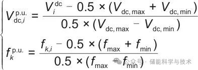 (1)归一化原理。由于交流频率和直流电压是不同的量纲,无法直接进行比较。基于下面的归一化公式,可以使得交流侧输出的频率和直流侧储能侧输出电压标幺值都在-1到1之间,归一化原理如式(12)所示: