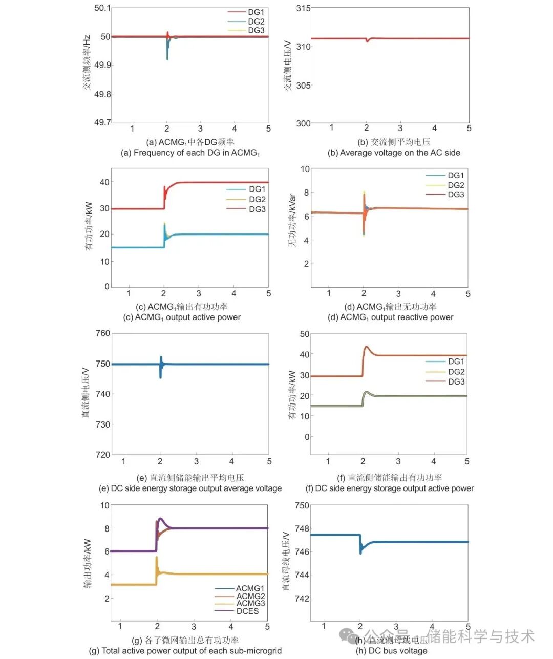 图8(a)、(b)展示了ACMG1中各个DG的频率以及各个DG输出电压的平均值,在分布式二次频率控制器以及分布式电压控制器的控制下,系统内部频率恢复到50 Hz,DG输出电压平均值恢复到311 V。在t=3 s负荷突变后,输出频率以及电压平均值也能稳定在额定值,即式(4)所示控制目标实现,在t=4.5 s时DG3断开,如图可知DG3的功率和电压分别不受控制。图8(c)、(d)展示了ACMG1各个DG的输出有功功率和无功功率。在分布式二次频率控制器以及分布式电压控制器的控制下,系统内各个DG输出的有功功率以及无功功率按下垂系数成比例分配,其比例分别为1∶1∶2和1∶1∶1,即式(5)所示控制目标实现,在t=4.5 s切掉DG3后,DG3输出的有功和无功均下降至0。图8(e)、(f)展示了直流侧储能输出的平均电压和输出的有功功率,在直流侧储能的分布式协调控制器的控制下,各DG输出的平均电压恢复到750 V,在t=3 s引入负荷变换以及t=4.5 s切电源后,也能稳定在额定值;各DG输出的有功功率按下垂系数成比例分配,其比例为1∶1∶2,即式(6)所示目标实现。图8(g)、(h)展示了各个子微网输出的总有功功率和IVSC直流侧母线电压。在集群协调控制器的控制下,各个子系统输出的总有功功率按照最大容量比例分配,且比例为2∶2∶1∶2。在3 s之前各个子系统的负荷和输出为60/60/30/60(kW),在t=3 s时直流侧引入负荷突增35 kW,输出变为70/70/35/70(kW);在t=4.5 s时ACMG1中的DG3断开后,ACMG1中的最大容量由原来的120 kW变为60 kW,各微网容量之比变为1∶2∶1∶2,输出变为40/80/40/80(kW),即式(7)所示目标实现。图8(h)表明,在分布式对等控制下,IVSC母线电压也基本维持在750 V附近,所提控制策略仍能实现该目标。