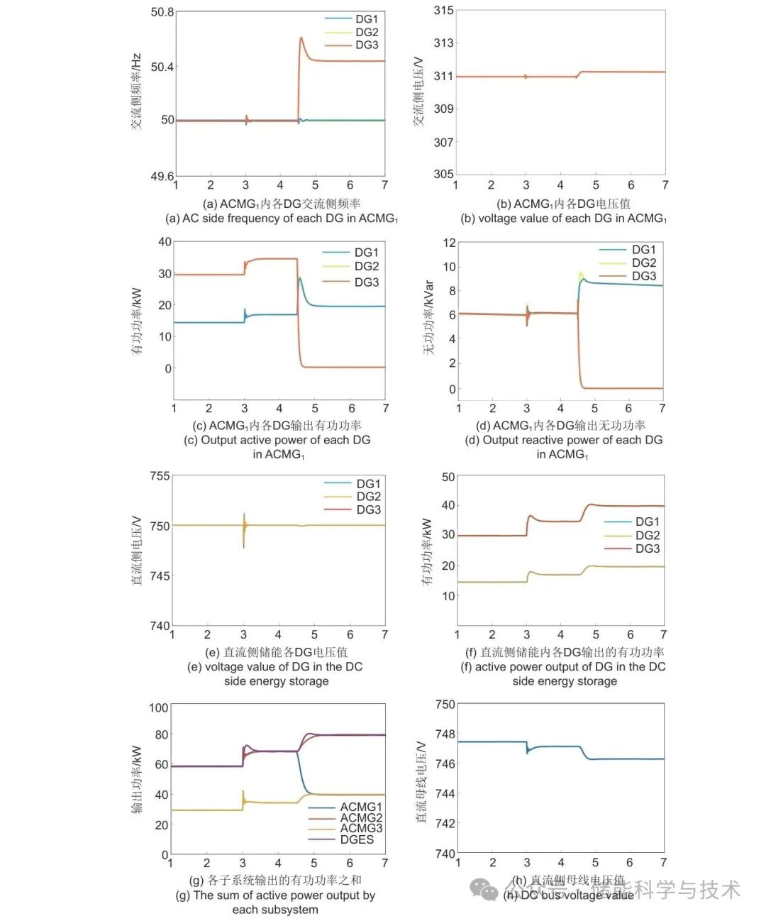 本算例针对系统因故障、极端事件等原因导致微网内DG与主系统断开的情况进行研究。首先,三层控制层均启动,在t=3 s时发生负荷突增,直流侧负荷突增35 kW;在t=4.5 s ACMG1中DG3由于系统故障导致其和微网断开,模拟分布式电源故障的场景,以此验证控制策略的稳定性以及可行性。图8为仿真结果图。