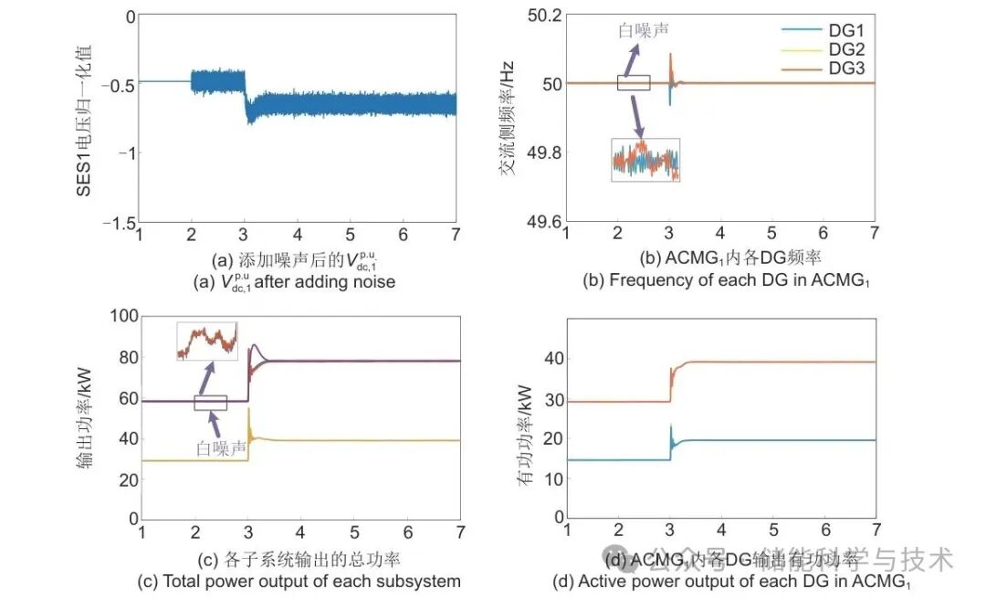上,如图9(a)所示为直流侧储能中DG1直流侧电压归一化后的值加上白噪声的影响后的效果图;在t=3 s时发生负荷突增,直流侧负荷突增70 kW。图9(b)为ACMG1的频率,在2 s时引入白噪声后,可以看到平滑的波形中出现了毛刺,但对控制目标的实现影响非常小;图9(c)为各子微网输出的总功率,在t=3 s发生负荷突增,其输出的结果依旧满足控制目标。结果表明,通信噪声的存在会造成一定的电能质量问题,但是并不会影响控制策略的有效性。