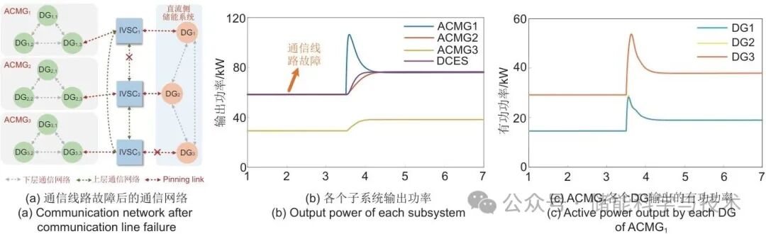 在t=2 s时,IVSC1与IVSC2之间的通信线路以及IVSC3与直流侧储能的DG3之间的通信线路中断,在t=3.5 s时,ACMG1侧负荷突增70 kW。如图10(b)为各个子微网的总功率,图10(c)为ACMG1内部各个DG输出的有功功率,从仿真结果图可以看出在t=2 s时,通信故障并不会对系统的仿真产生影响。根据一致性算法协议,通信错误后上层通信网络依旧存在最小生成树,系统的通信线路也具有一定的稳定性,在发生通信故障后并不会引起波动,在后续的负荷突增时,各个微网以及DG输出的有功满足控制目标。
