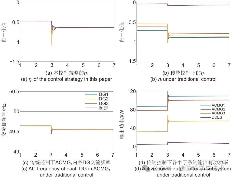 本算例提供了本工作所提控制方法与传统控制方法的对比。传统控制方法仅使用本地控制,其中IVSC分别采用如式(3)的VdcQ控制,交流侧和直流侧储能内部各个DG分别采用式(1)和式(2)所示的控制策略。其运行条件与Case1相同:在t=3 s引入负荷突增,直流侧负荷增加70 kW,图11展示了对比结果。图11(a)为本控制策略归一化后