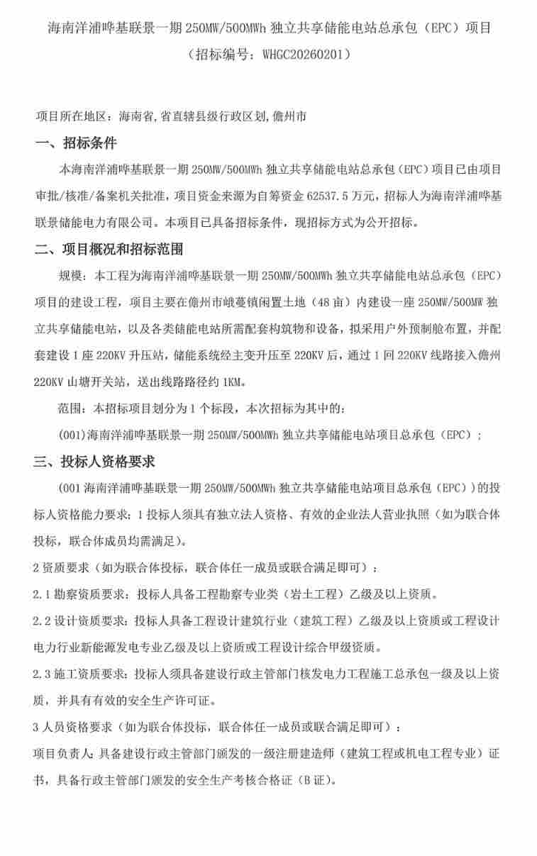北极星储能网讯:2026年1月23日,海南洋浦哗基联景一期250MW/500MWh独立共享储能电站总承包(EPC)项目发布招标公告,项目资金来源为自筹资金62537.5万元,约合单价1.25元/Wh。