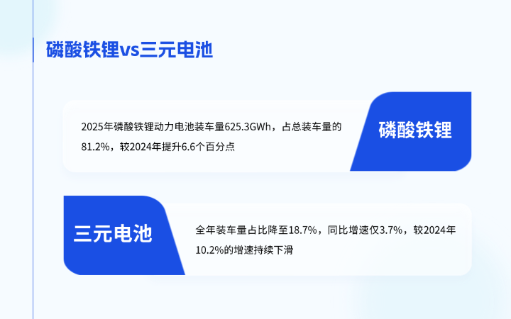 2025年磷酸铁锂动力电池装车量625.3GWh,占总装车量的81.2%,较2024年提升6.6个百分点,全年同比增长52.9%;12月单月装车79.8GWh,占比攀升至81.3%,环比仍增长5.9%;销量端表现更突出,全年销量占比达72.9%,同比增长66.6%。