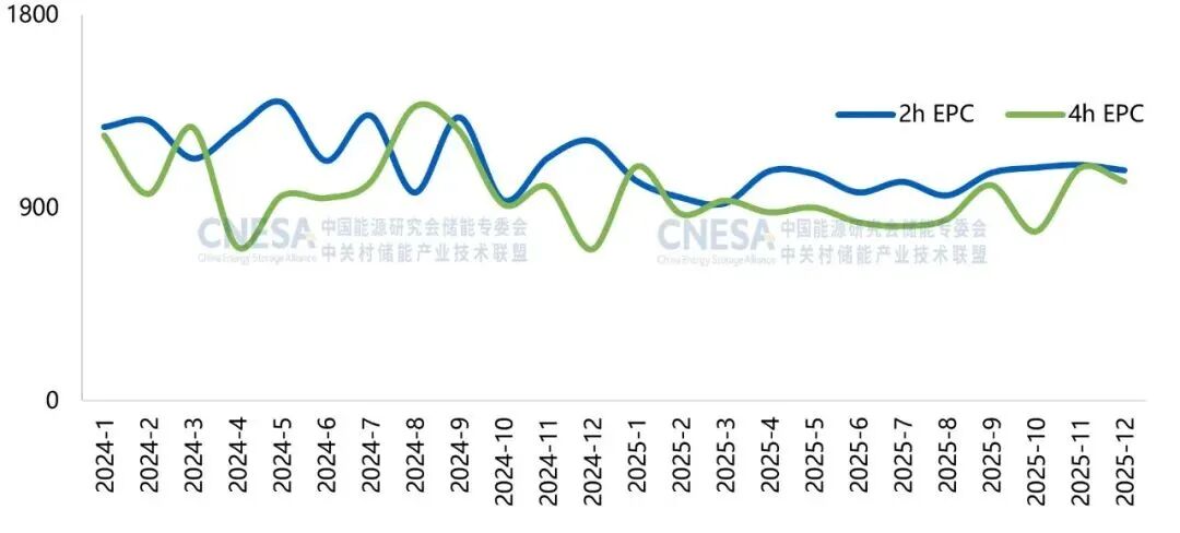 根据CNESA DataLink全球储能数据库的不完全统计,2025年储能系统(磷酸铁锂系统,不含用户侧应用)采购中标价格在391.14元/kWh-913.00元/kWh之间,其中不同时长系统价格降价幅度差异大。0.25C储能系统价格下降幅度接近0.5C的两倍。2025年EPC(不含用户侧)中标价格呈现出波动下行的趋势,2h EPC的中标均价已降至1043.82元/kWh,同比下降13.04%;4h EPC的中标均价为935.40元/kWh,同比下降8.19%。