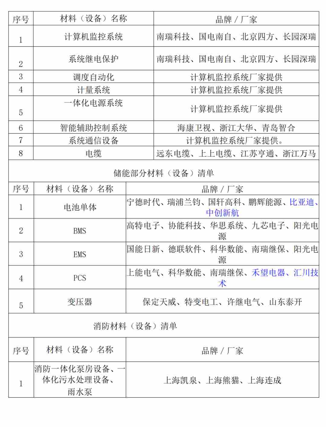 与此同时,文件明确储能设备整机免费质保由8年修改为6年。另外,附件还明确了主要材料设备的共计56家参考品牌,其中储能相关的企业18家,电池单体参考品牌包含宁德时代、瑞浦兰钧、国轩高科、鹏辉能源、比亚迪、中创新航;BMS包含高特电子、协能科技、华思系统、九芯电子、阳光电源;EMS包含国能日新、德联软件、科华数能、南瑞继保、阳光电源;PCS包含上能电气、科华数能、南瑞继保、禾望电器、汇川技术。