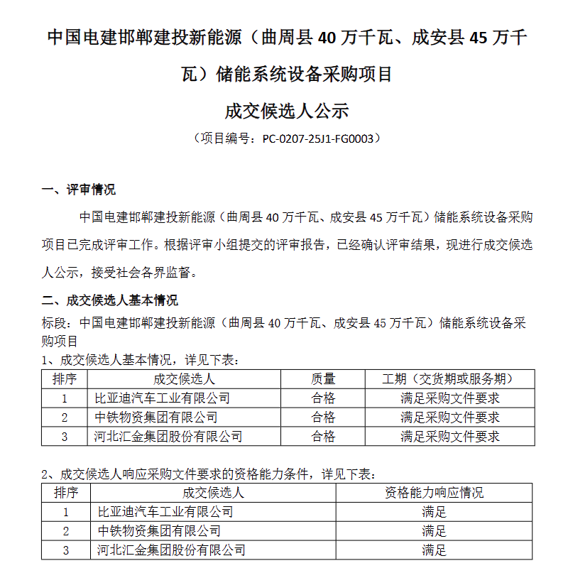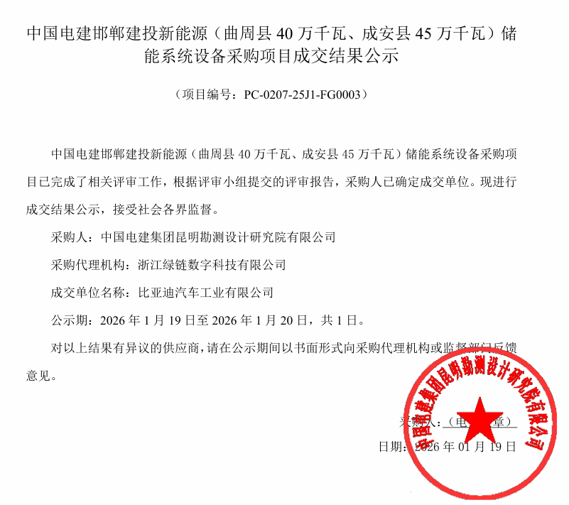 北极星储能网讯:2026年1月19日,中国电建邯郸建投新能源(曲周县40万千瓦、成安县45万千瓦)储能系统设备采购项目成交结果公示,成交单位为比亚迪汽车工业有限公司。
