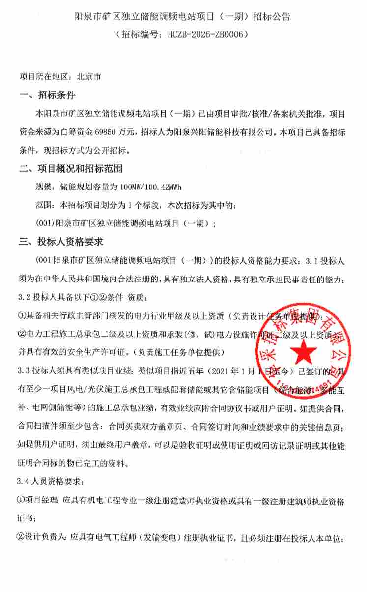 北极星储能网讯:近期,全国多地迎来三大调频储能电站的招标热潮。山西、辽宁、北京等地三大独立储能调频电站陆续公开招标,总规模达300MW/325.37MWh。三个项目均接受联合体投标,须满足相关条件。