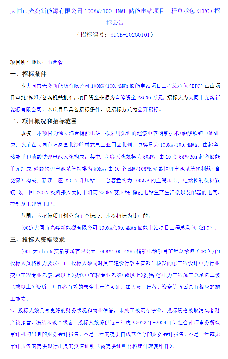 山西省大同市光奕新能源有限公司100MW/100.4MWh储能电站项目工程总承包(EPC)
