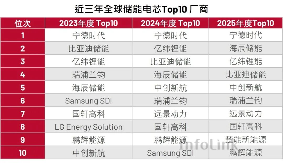 InfoLink:2025年度全球及海外市场储能电芯出货排名