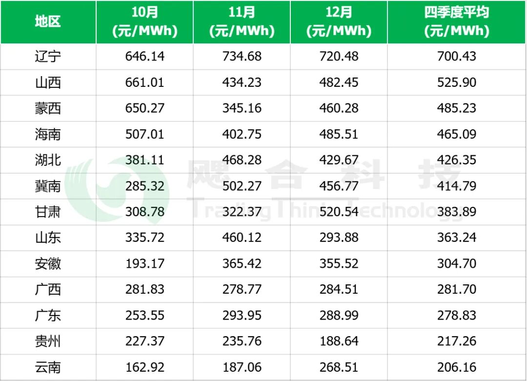 现货价差呈现出明显的南北方差异,原因主要有以下两方面:首先,储能价差的本质是市场机制下的峰谷电价差,辽宁、山西、蒙西等省份新能源装机容量大,而且市场竞争充分,实现了“低充高放”的较高价差收益;其次,四季度期间南网地区阴雨天气普遍多于北方,导致南网区域新能源出力大幅降低,峰谷价差缩小,最终呈现明显的南北方差异。