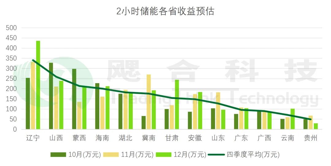 2小时储能收益中,辽宁、山西、蒙西收益较高,月均收益在200-340万元之间;南网区域收益整体偏低。