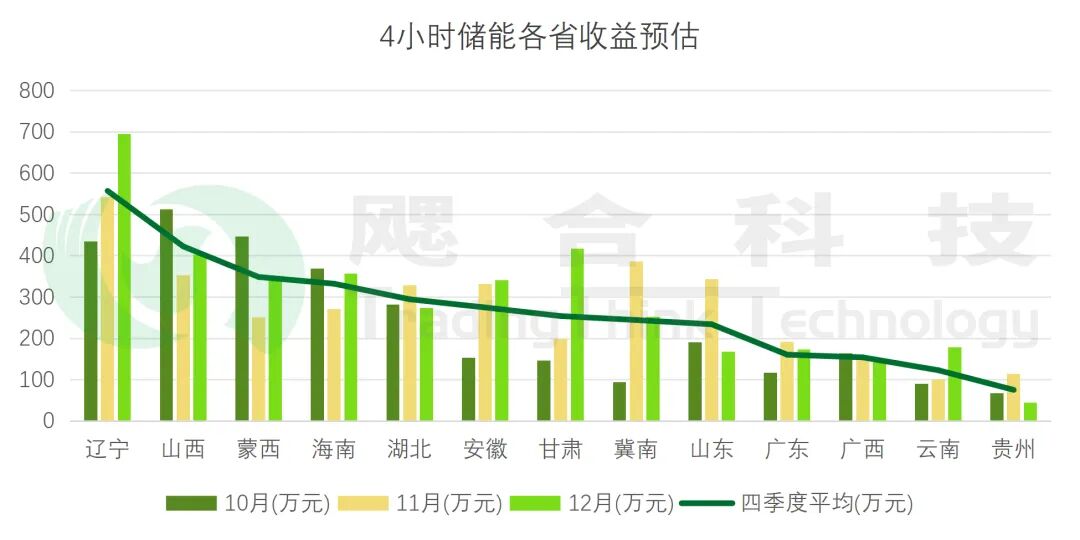 4小时储能的收益排名与2小时储能基本一致,第一梯队仍是辽宁、山西、蒙西三省,月均收益在340-560万元之间。