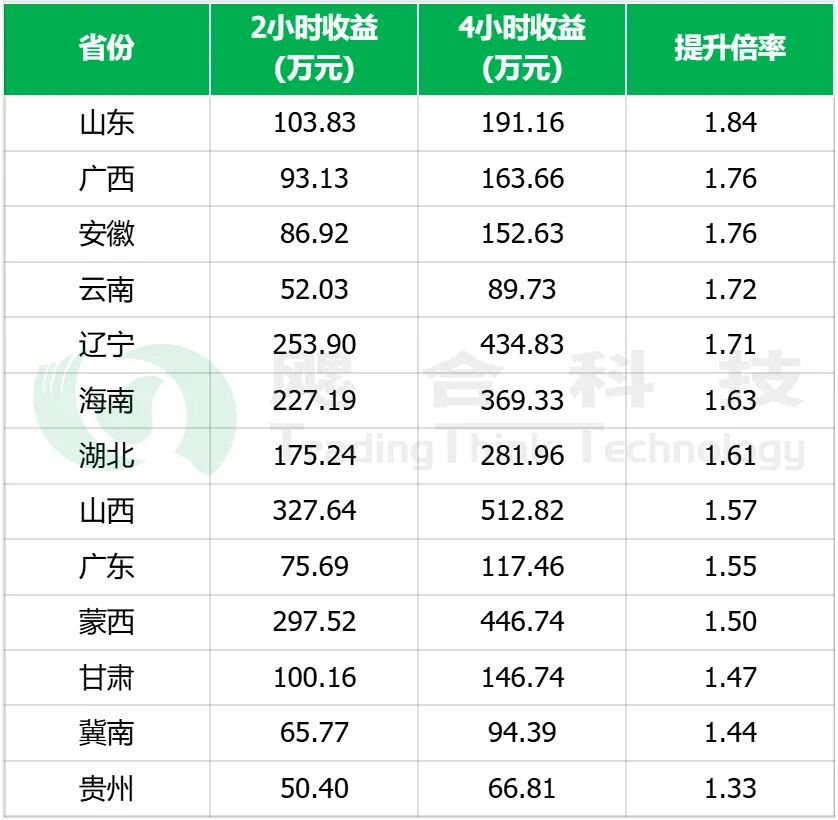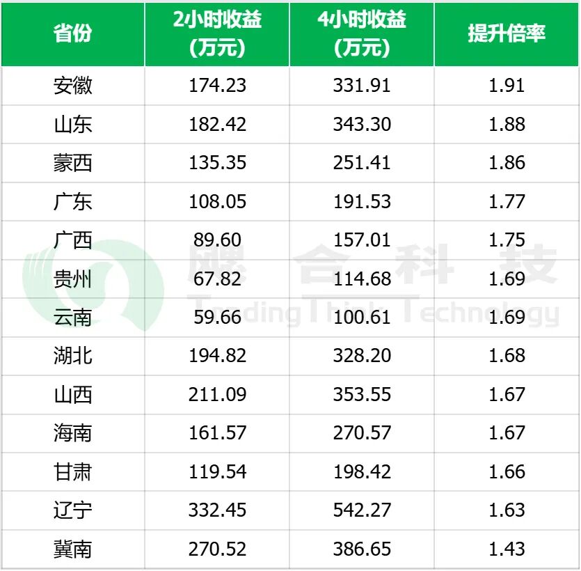 表6 2小时与4小时储能系统,四季度平均收益倍率提升