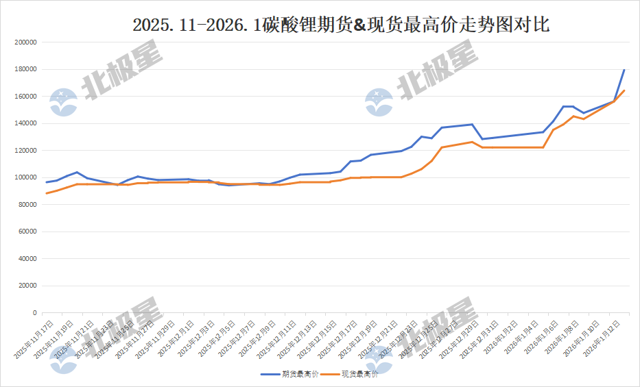 自2025年6月,碳酸锂价格上扬态势愈演愈烈,进入2026年更是一天一涨,1月5日升至13.3万元/吨,1月6日14.13万元/吨,1月7日突破15万元/吨大关,1月12日高达15.6万元/吨,截至1月13日最新消息,碳酸锂期货主力合约触及涨停,单日涨幅12%,报17.9万元/吨。