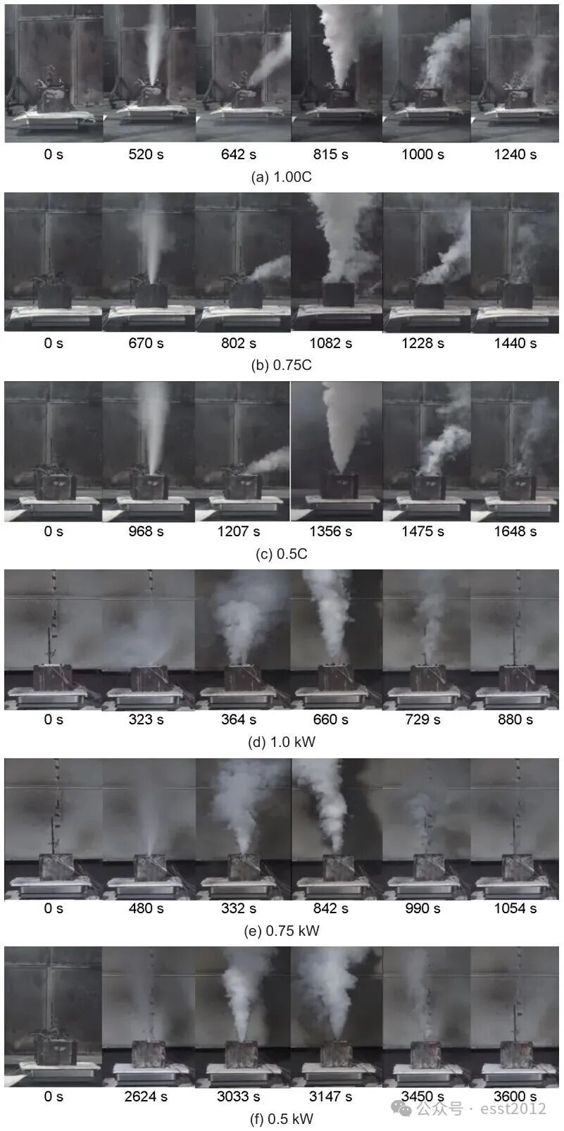 第2阶段现象差异:高功率加热(1.0 kW)时,开阀时间较短,且相比过充释放白烟,过热条件下开阀喷射更多电解液;而在低功率(0.5 kW)加热条件下,安全阀打开后短暂出现灰色烟雾,推测长时间低功率加热可能导致电解液中的部分有机溶剂发生热解,烟雾中包含生成的碳氧化物和Li2CO3沉积。
