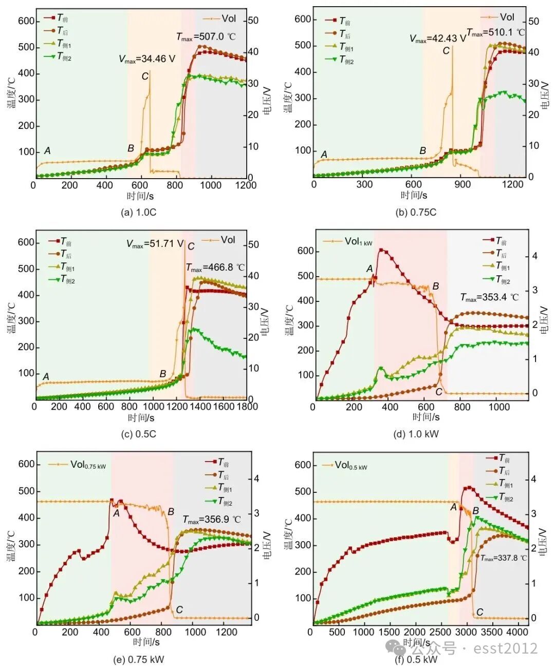 第1阶段:初期阶段。在过充初期,电压缓慢上升至A点,之后,由于阳极沉淀和锂离子耗尽之间的动力学平衡,电压稳定在一个平台值。这一阶段电池表面温度缓慢上升。在加热初期,电池温度逐渐升高,电压基本保持稳定在A点。这是因为在初始阶段,电池内部的化学反应和电荷传输尚未受到显著影响,电池内部电阻变化较小,温度和电压的变化较为缓慢。