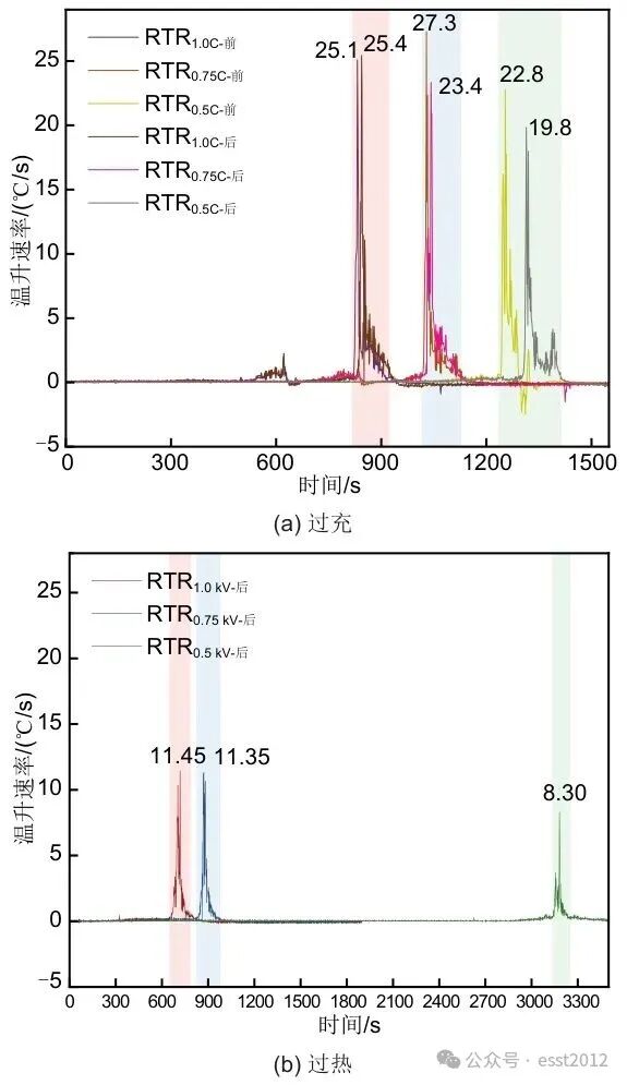 图5呈现了不同热失控条件下的温升速率。可以发现,过充和过热条件下引发的电池温度变化存在显著差异。在过充过程中,电池内部发生电化学副反应的连锁失衡。温升速率可达25 ℃/s,快速上升的温度导致电池壳体涂层熔化剥离。相比之下,过热引发的热失控主要由外部热源或内部产热失控引发,多依赖于热积累效应,高温环境下电解液挥发压力急剧增加,温升速率约为10 ℃/s。这表明在过充条件下,电池表现出更为显著的温度变化趋势,具有较高的安全风险。