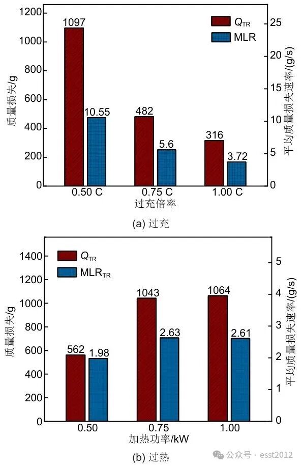 图9给出了不同热失控条件下磷酸铁锂电池的热失控危害评估结果,从图9(a)可以看出,过充倍率越大,电池热失控触发温度(TTR)越高,触发时间(tTR)越小;而最高温度(Tmax)和最大温升速率(RTRmax)则差别不大;平均质量损失率(Mavg-TR)和热失控结束后的最大质量损失(MLoss)则与过充倍率呈负相关。这表明,电池热管理系统(BMS)的设计需充分考虑不同充电倍率下的散热需求。在高倍率过充场景下,应着重强化过充保护功能,提前启动高效散热机制。确保当充电倍率有升高趋势接近可能引发危险的数值时,能迅速切断充电电路,防止电池因过充而进入热失控的高风险状态,保障电池使用的安全性。