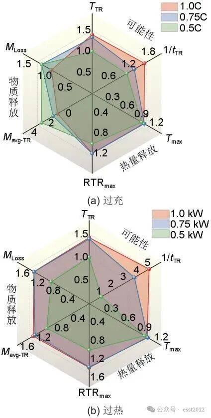 (3)基于雷达图的多指标简化评估模型表明:在高倍率过充情境下,电池热失控发生的可能性更高,各样本间热危害水平趋于相近,但物质释放量相对较少。而高功率加热情境下,电池热失控发生的可能性更高,热危害和物质释放均显著增加。