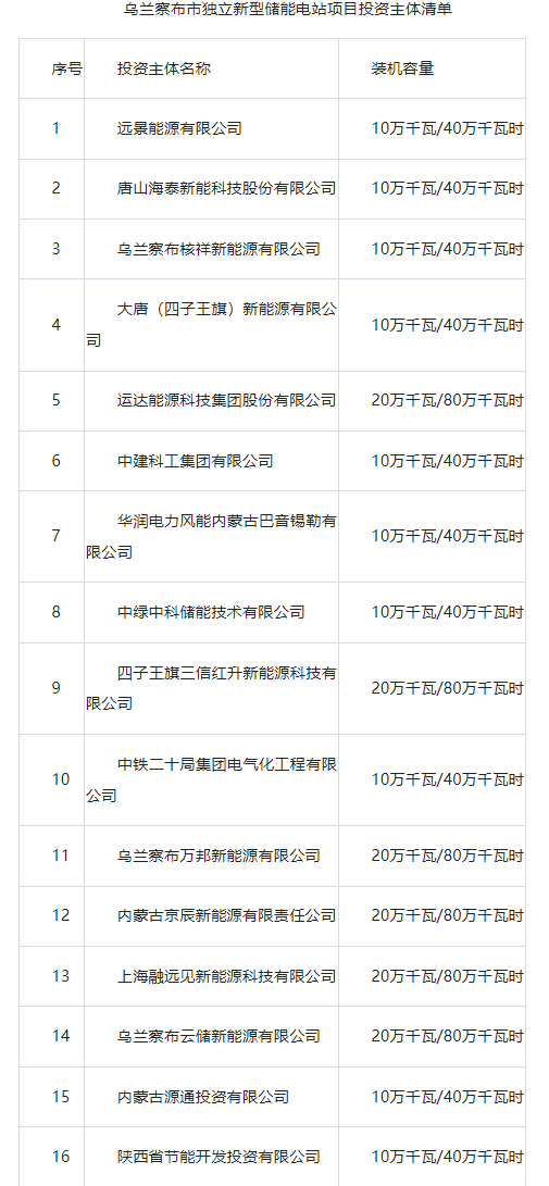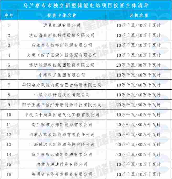 其中运达能源科技集团股份有限公司、四子王旗三信红升新能源科技有限公司、乌兰察布万邦新能源有限公司、内蒙古京辰新能源有限责任公司、上海融远见新能源科技有限公司、乌兰察布云储新能源有限公司中选规模均为200MW/800WMh;远景能源有限公司、唐山海泰新能科技股份有限公司、乌兰察布核祥新能源有限公司、大唐(四子王旗)新能源有限公司、中建科工集团有限公司、华润电力风能内蒙古巴音锡勒有限公司、中绿中科储能技术有限公司、中铁二十局集团电气化工程有限公司、内蒙古源通投资有限公司、陕西省节能开发投资有限公司中选规模均为100MW/400WMh。
