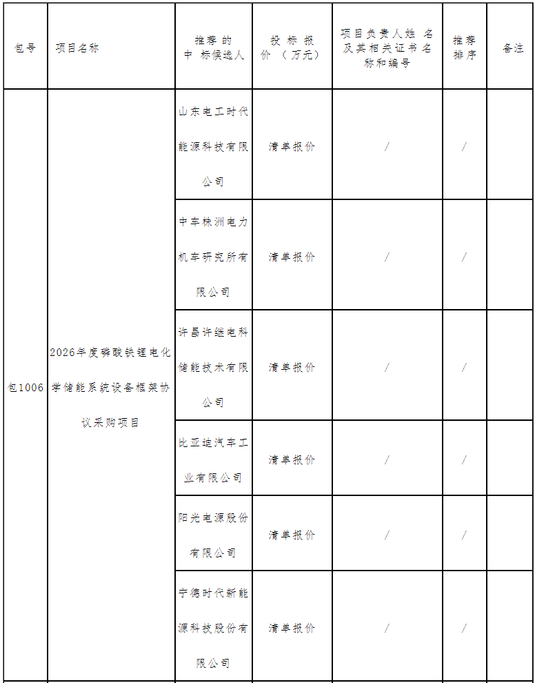 北极星储能网讯:2026年1月6日,中国绿发投资集团公示了2026年度磷酸铁锂电化学储能系统集采的中标候选人,入围企业包含山东电工时代能源科技有限公司、中车株洲电力机车研究所有限公司、许昌许继电科储能技术有限公司、比亚迪汽车工业有限公司、阳光电源股份有限公司、宁德时代新能源科技股份有限公司。