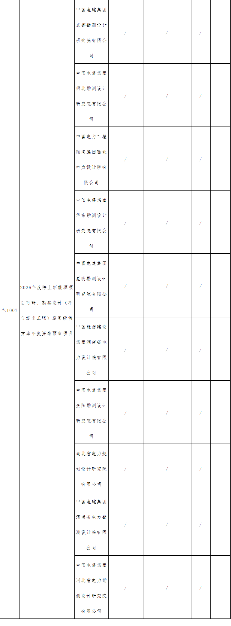 另外,中国绿发投资集团针对2026年度陆上新能源项目可研、勘察设计(不含送出工程)通用级供方库年度资格预审也已经开标,来自中国电建和中国能建旗下的共10家设计单位入选中标候选人,详细名单包括:中国电建集团成都勘测设计研究院有限公司、中国电建集团西北勘测设计研究院有限公司、中国电力工程顾问集团西北电力设计院有限公司、中国电建集团华东勘测设计研究院有限公司、中国电建集团昆明勘测设计研究院有限公司、中国能源建设集团湖南省电力设计院有限公司、中国电建集团贵阳勘测设计研究院有限公司、湖北省电力规划设计研究院有限公司、中国电建集团河南省电力勘测设计院有限公司、中国电建集团河北省电力勘测设计研究院有限公司。