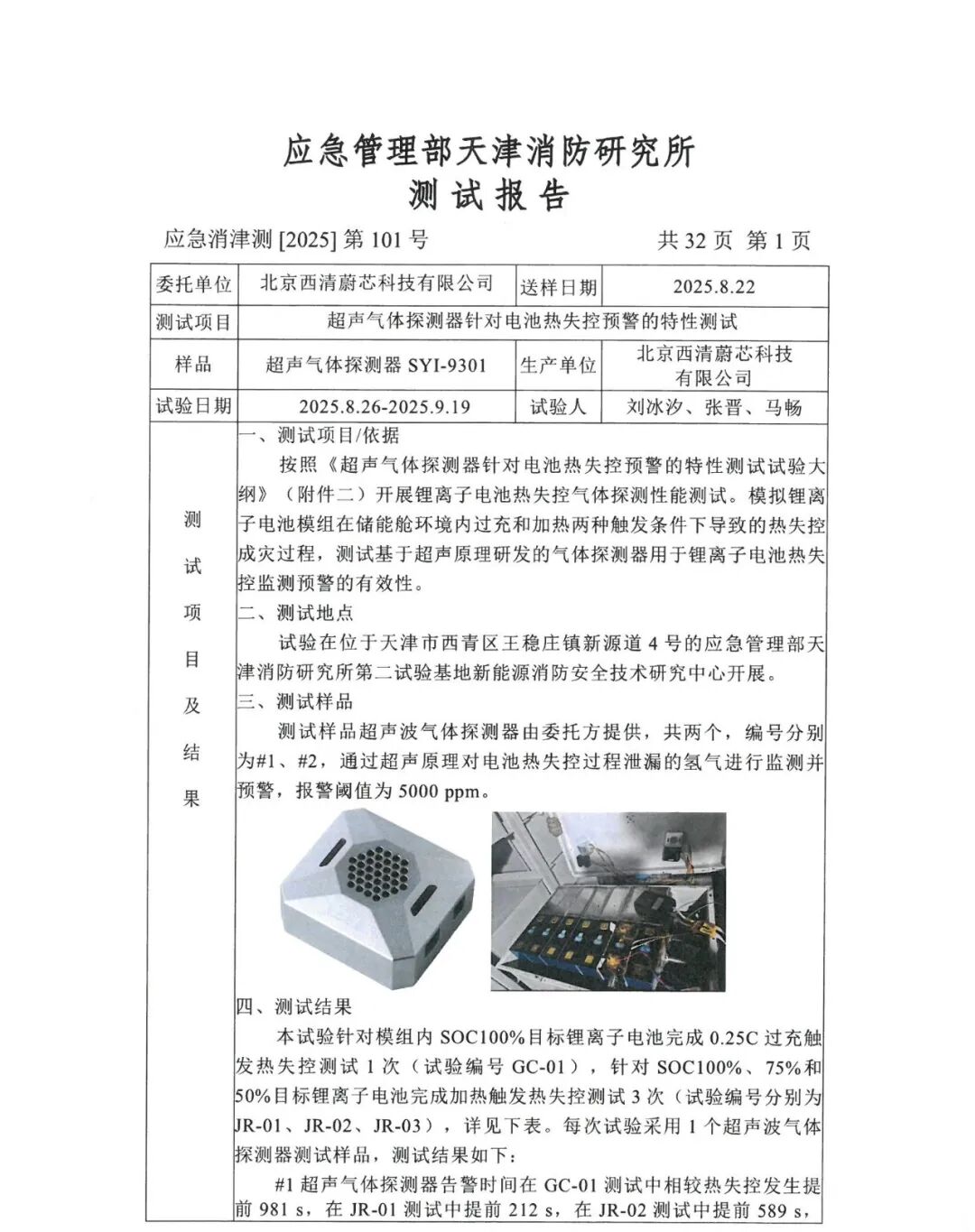10年寿命,可提前24分钟发出热失控预警!西清能源超声气体探测器通过天消所测试
