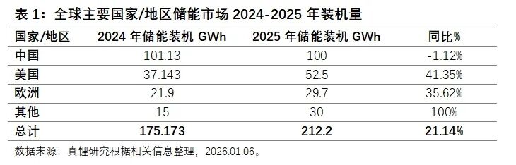 已经进入2026年,全球储能市场2025年到底发展得是一个什么样的情况,已经可以做出大致判断了。真锂研究通过对包括中国的国家能源局、Wood Mackenzie/ACP、SolarPower Europe、Energy Storage Europe(原欧洲储能协会)、BNEF、Rho Motion、标普等在内的储能领域主要机构的数据整理分析研究,推断2025年全球储能电池装机总量大约212GWh左右,同比增长约21%。主要国家和地区的储能市场具体发展情况见表1。
