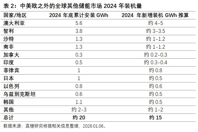 除欧美之外的海外其他储能市场的发展其实也就是最近两年的事。从表2可以看到,2024年之前其他海外市场储能电池总装机量累计只有5GWh左右,而2024年一年就新增了15GWh。基数小,所以发展速度惊人,主要的驱动因素包括可再生能源整合、电网稳定和政策支持。这种高速发展态势2025年还在延续。