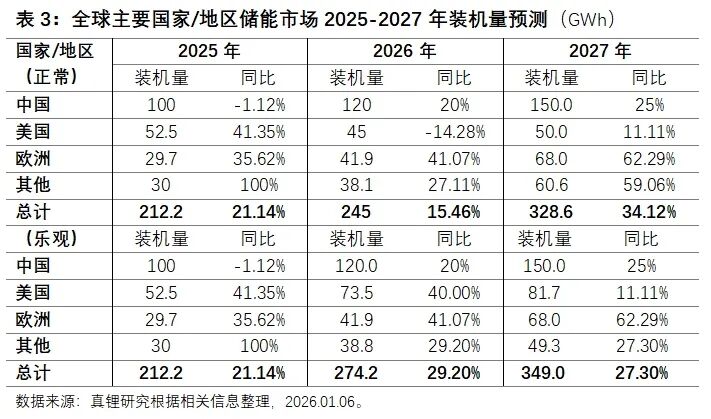 由于供给侧的储能电池出货量数据的水分很大,我们只能从需求侧的储能电池装机量预测来着手判断上一年度的储能电池真实的出货量情况。现在我们来研判一下2026和2027年全球储能电池装机量,以此来推导2025和2026年的储能电池出货量。