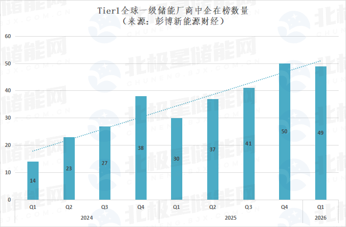 从图中可以看出,2024年全年中企在榜数量稳步上升,第四季度呈爆发式增长;2025年第一季度虽相比前一季度有所下降,但全年仍处上升态势,且第四季度达到历史最高;2026年第一季度较上一季度微有下降,但较2024年第一季度同比增长250%,较2025年第一季度同比增长63.3%,体现出中国企业在储能领域全球竞争力持续提升。