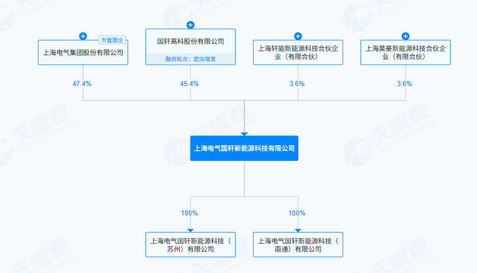 据公开信息显示,上海电气国轩新能源科技有限公司成立于2017年12月,注册资本5亿元,由四家企业共同控股。其中,上海市国资委实控企业上海电气集团股份有限公司持股47.4%,为电气国轩第一大股东;储能巨头国轩高科股份有限公司持股45.4%,为第二大股东;剩余股份由两家员工持股平台持有。综合来看,电气国轩系国资与储能巨头合资设立的国有相对控股企业。