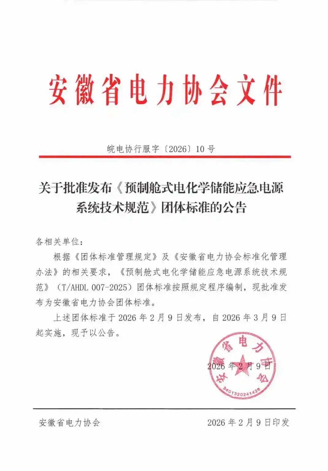 今日,安徽省电力协会正式发布《预制舱式电化学储能应急电源系统技术规范》(T/AHDL 007-2025)团体标准,该标准由汉星能源牵头编制,历经多次专家研讨、公开征求意见及专业评审,于2026年2月9日正式发布,自2026年3月9日起实施。