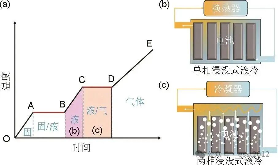 材料吸收热量时会使自身温度升高或发生相转变,如[图3(a)]所示:固态材料吸收热量温度升高(OA段);到达熔点时发生固-液相变(AB段);完全转变为液态后温度继续升高(BC段);到达沸点时发生液-气相变(CD段);完全转变为气态后温度继续升高(DE段)。相应的热量在存储过程中存在两种形式:显热存储(OA段、BC段和DE段)和潜热存储(AB段和CD段),且潜热储存量远高于显热储存。固-液相变由于相变潜热大、相变前后体积变化小、过冷度低、化学性质稳定和成本低廉等优点常用作相变材料冷却系统,也是锂/钠离子电池常见的热管理系统之一。依靠材料的吸热特性,液冷技术主要通过BC段和CD段液体作为冷却液,吸收热量实现电池组温度的降低。根据冷却液在散热过程中是否发生液-气相变,浸没式液冷技术可分为单相浸没式液冷和两相浸没式液冷,这两种系统在工作原理和应用场景等方面存在一定的差异,表1中直观地对比了两种浸没式液冷技术。