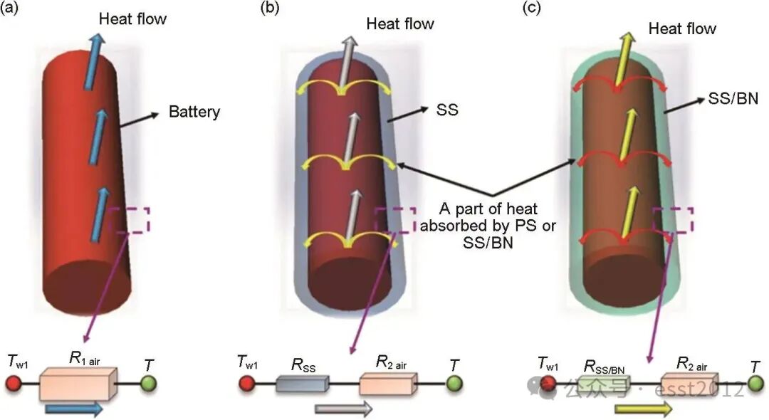 图4 电池的不同散热模式:(a)空气冷却模式;(b)纯SS冷却模式和(c) SS/BN冷却模式