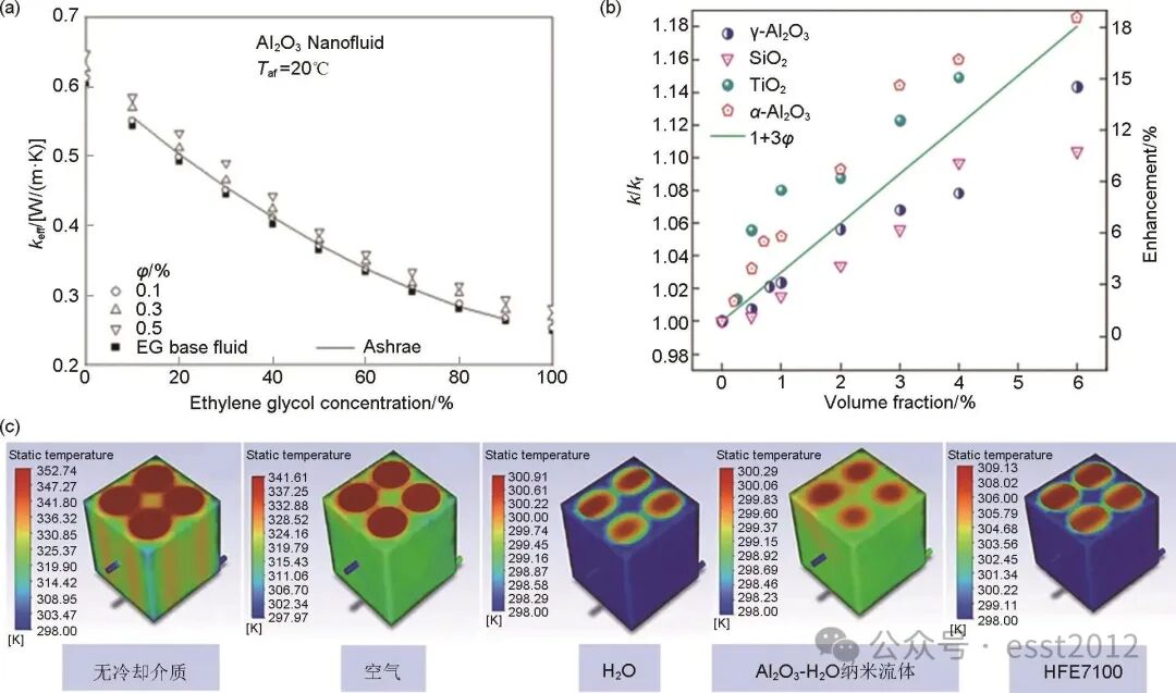 纳米流体是指金属或非金属纳米粉分散到水、醇和油等传统换热介质中,制备成均匀、稳定和高导热的新型换热介质。在电池热管理领域,Cu、Al、CuO、Al2O3、TiO2、SiO2、CNTs等纳米颗粒常添加到水和醇混合溶液中,以提高冷却液的导热系数。Zakaria等研究了在乙二醇和水混合溶液中添加Al2O3对其热导率的影响。结果表明乙二醇和水混合溶液的热导率会随着乙二醇含量的增加而降低[图5(a)];然而,对于特定的乙二醇和水混合溶液(50∶50,体积比),当Al2O3纳米颗粒的体积分数分别为0.1%、0.3%和0.5%时,热导率分别提升约2%、4.2%和7.5%。Das研究了普通纳米流体和混合纳米流体的热导率,发现混合纳米流体热导率是纳米颗粒体积分数的增函数。即当Al2O3、TiO2和SiO2的添加量(φ)在0~6%之间时,混合纳米流体的热导率提升量可以用1+3φ来近似表示[图5(b)]。Kumar等人开发了电池热管理系统(BTMS)的三维计算流体动力学(CFD)模型,该模型包含2×2排列的圆柱形锂离子电池。该BTMS的CFD使用空气、水、Al2O3-水纳米流体和HFE7100四种冷却介质进行模拟。设置所有冷却剂的入口温度为298K,风冷、水冷、纳米流体和HFE7100电池组在5 C放电速率下最高温度分别为341.61、300.91、300.29和309.13K[图5(c)],表明水和Al2O3-水纳米流体是高倍率运行时BTMS的最佳冷却剂,而空气冷却会导致电池组热失控。