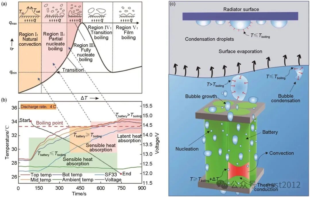 图6 (a) 沸腾曲线;(b) 4 C放电时的温度演变过程以及 (c) 沸腾传热行为的示意图