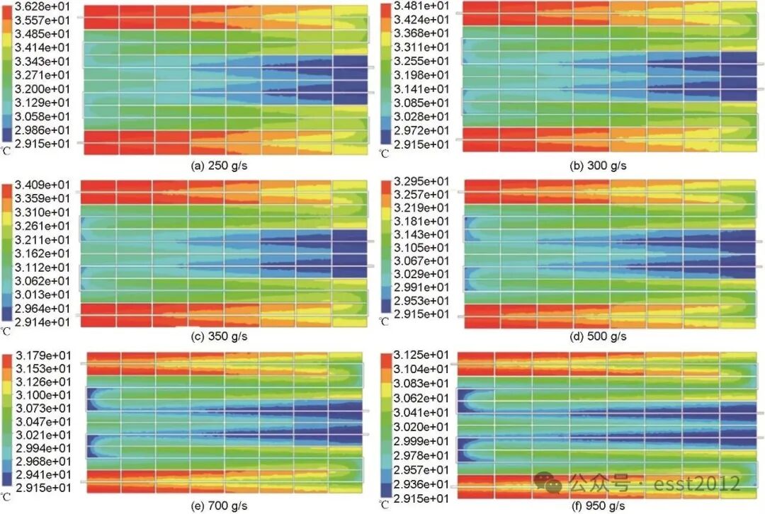 图7 不同入口流量下电池组的温度分布: (a) 250 g/s;(b) 300 g/s;(c) 350 g/s;(d) 500 g/s;(e) 700 g/s;(f) 950 g/s