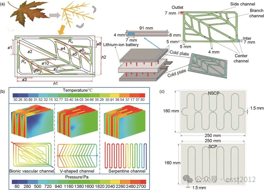 图8 (a) 叶形通道结构的BTMS;(b) 具有不同流道结构的电池模块的温度和流道压力图;(c) NSCP和SCP液冷板流道示意图