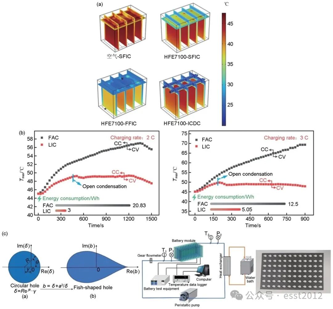 (3)结合钠离子电池产热的阶段性特征,开发多技术融合与智能化管理策略,如开发分阶段流量控制策略,在低产热阶段降低泵耗,高热阶段提升流量,实现能效优化;通过三维仿真模型实时预测电池组温度分布,动态调整冷却液流量、流速及流道切换,避免局部过热。