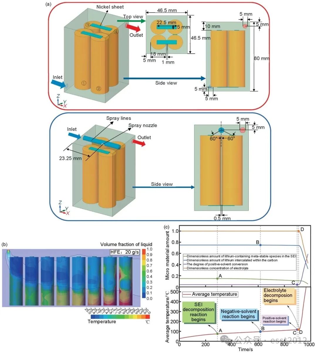 图10 (a) 喷淋浸没式液冷示意图;(b) HFE液滴在电池模块中的运动轨迹和分散情况;(c) 模拟电池过热阶段的温度变化
